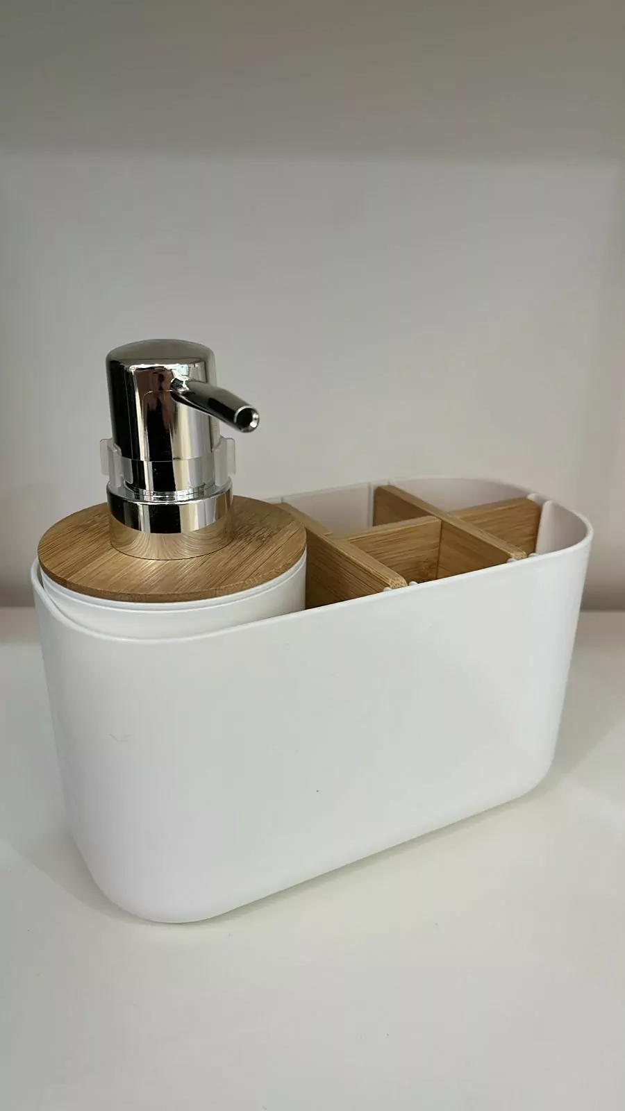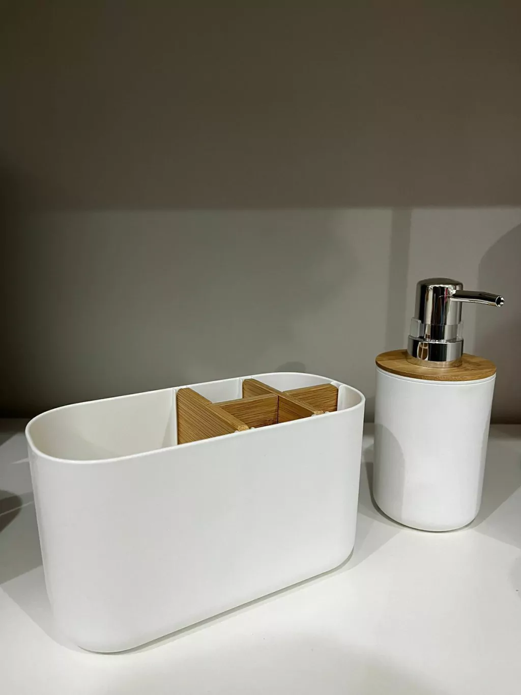 O Kit Organizador de Banheiro com Dispenser 280ml Branco/Bambu Mood é ideal para a organização de seu banheiro ou lavabo.